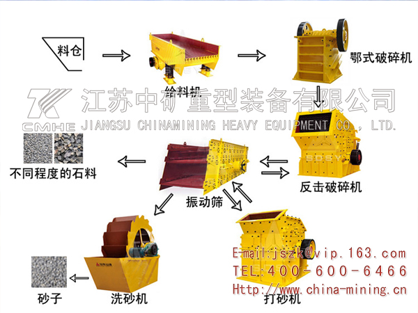 制砂生產(chǎn)線在工作過程中,大塊石料經(jīng)料倉由振動給料機均勻地送進顎式破碎機進行粗碎,粗碎后的石料由膠帶輸送機送入圓錐破碎機(或反擊式破碎機)進行中碎,中碎后的石料由膠帶輸送機送進振動篩進行篩分,成品砂子(篩下物)由膠帶輸送機送至洗砂機清洗后再通過膠帶輸送機送至成品料堆;大顆粒石料(篩上物)由膠帶輸送機送至立式?jīng)_擊破碎機(制砂機)進行細碎,細碎后的石料由膠帶輸送機再次送進振動篩進行篩分,這樣形成閉路多次循環(huán)。