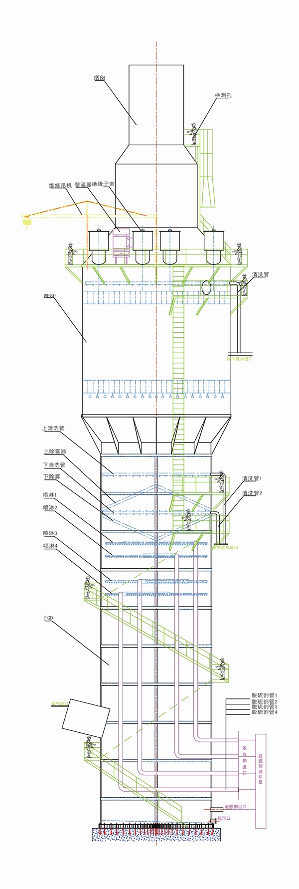 WESP本體采用圓形結(jié)構(gòu),設(shè)有煙氣導(dǎo)流板和氣體分布板,外殼體為碳鋼,內(nèi)襯玻璃鱗片防腐。WESP出口的頂部,安裝直排煙囪,降低煙氣的阻力WESP脫除了凈煙氣中的液體,收集后的液體自流返回吸收塔。